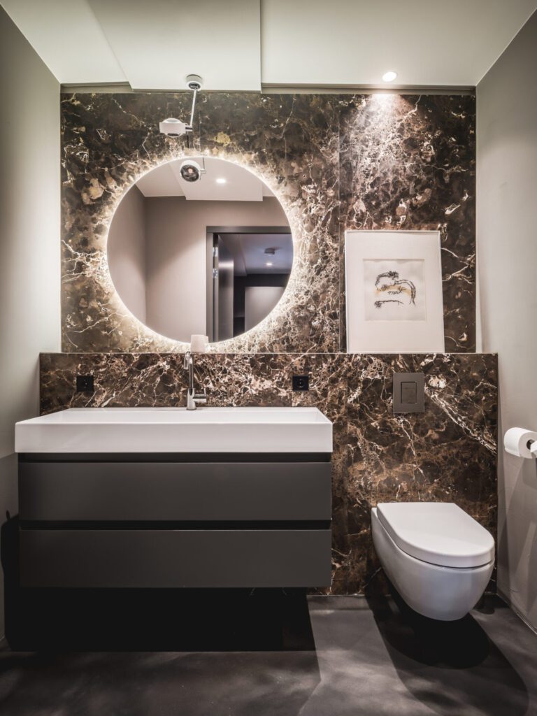 In de slaapkamer worden natuurlijke afwerkingen gebruikt, prachtig natuursteen wat opleeft als het strijklicht het raakt, en de met leer afgewerkte kasten zorgen voor warmte en spanning. Een onderkomen waar onze opdrachtgever even kan ontvluchten uit de drukte van de stad, en kan genieten van zijn rust.