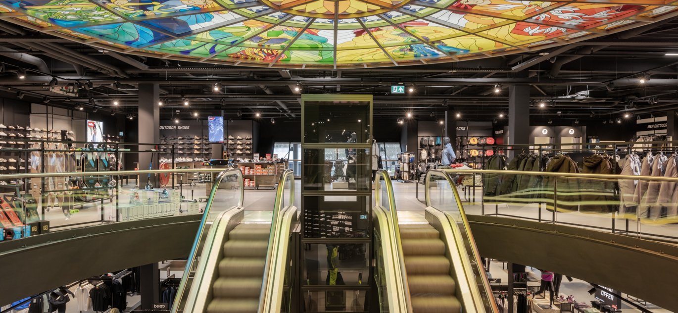 Bijzonder detail: het bestaande kunstwerk aan het plafond boven de roltrappen is behouden gebleven, een mooie verbinding tussen het verleden en het vernieuwde winkelinterieur.