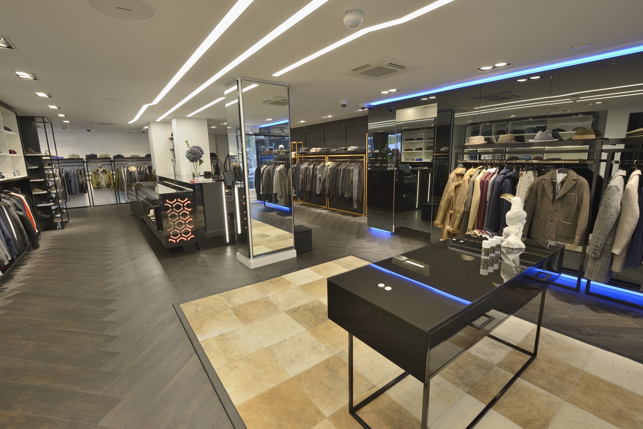 Rick Schreuder van WSB over het conceptontwerp winkelinrichting van herenmode zaak Kings Square: “Turn key verbouwing van multibrand winkel op toplocatie Amsterdam. Moet een warm welkom zijn voor zowel lokaal als internationaal cliënteel. De winkel is een podium biedend decor voor topmerken als Colmar, CP Company, John Varvatos, Peutery, Kenzo. Integratie van accessoires als schoenen, sieraden en luxe parfums is een must.”